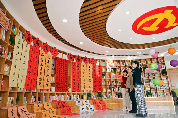 各地创新载体、丰富形式,让廉洁文化融入日常、深入人心。图为山东省邹平市高新街道兴业社区居民在廉政教育基地观看清廉楹联展。