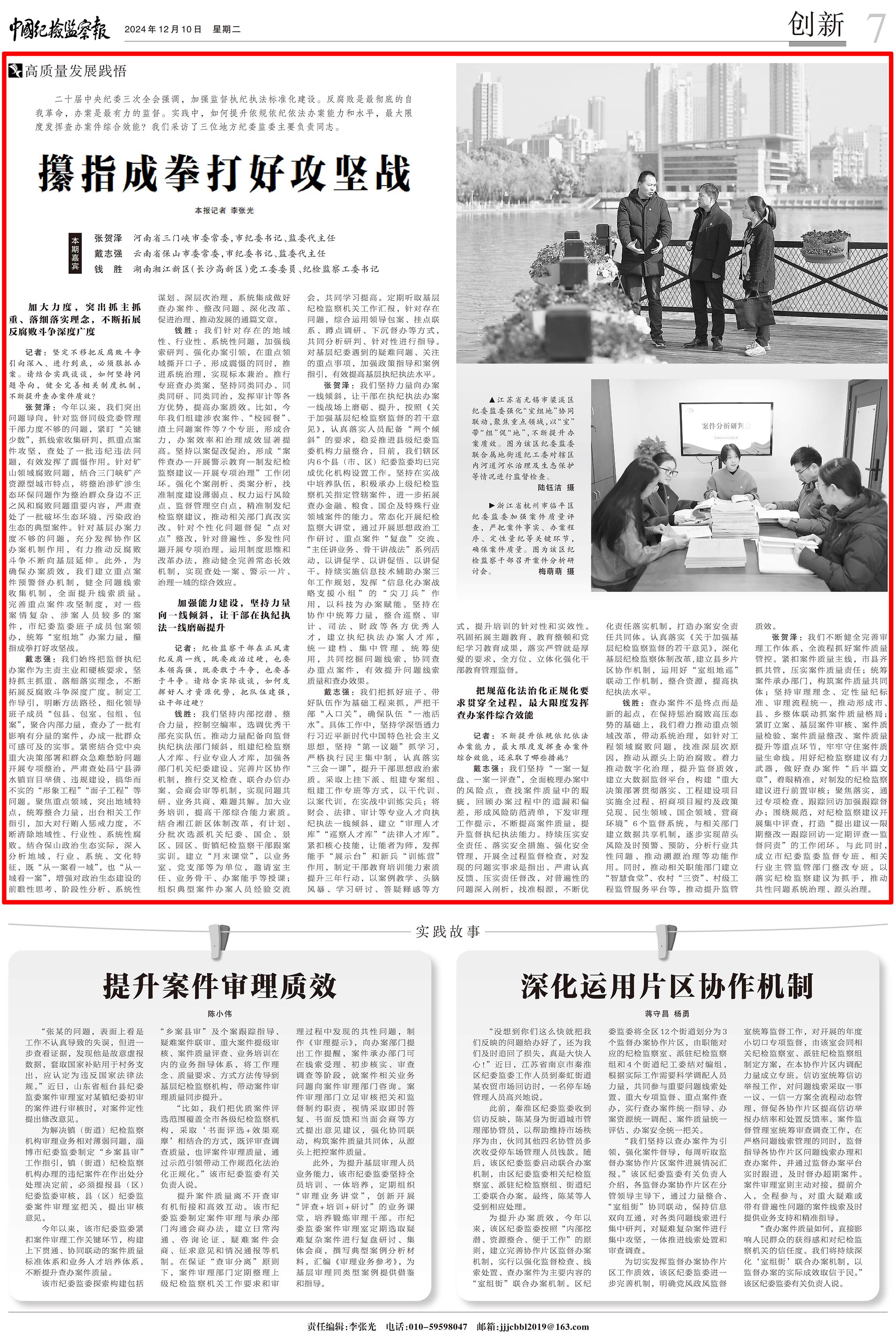 12月10日,《中国纪检监察报》7版头题刊发《攥指成拳打好攻坚战》访谈文章,三门峡市委常委、市纪委书记、市监委代主任张贺泽接受采访,展示三门峡市纪检监察机关坚持问题导向,健全完善相关制度机制,不断提升查办案件质效;坚持力量向办案一线倾斜,建强队伍,充分发挥人才资源优势;全流程抓好案件质量管控,做好查办案件“后半篇文章”,发挥查办案件综合效能的做法成效。