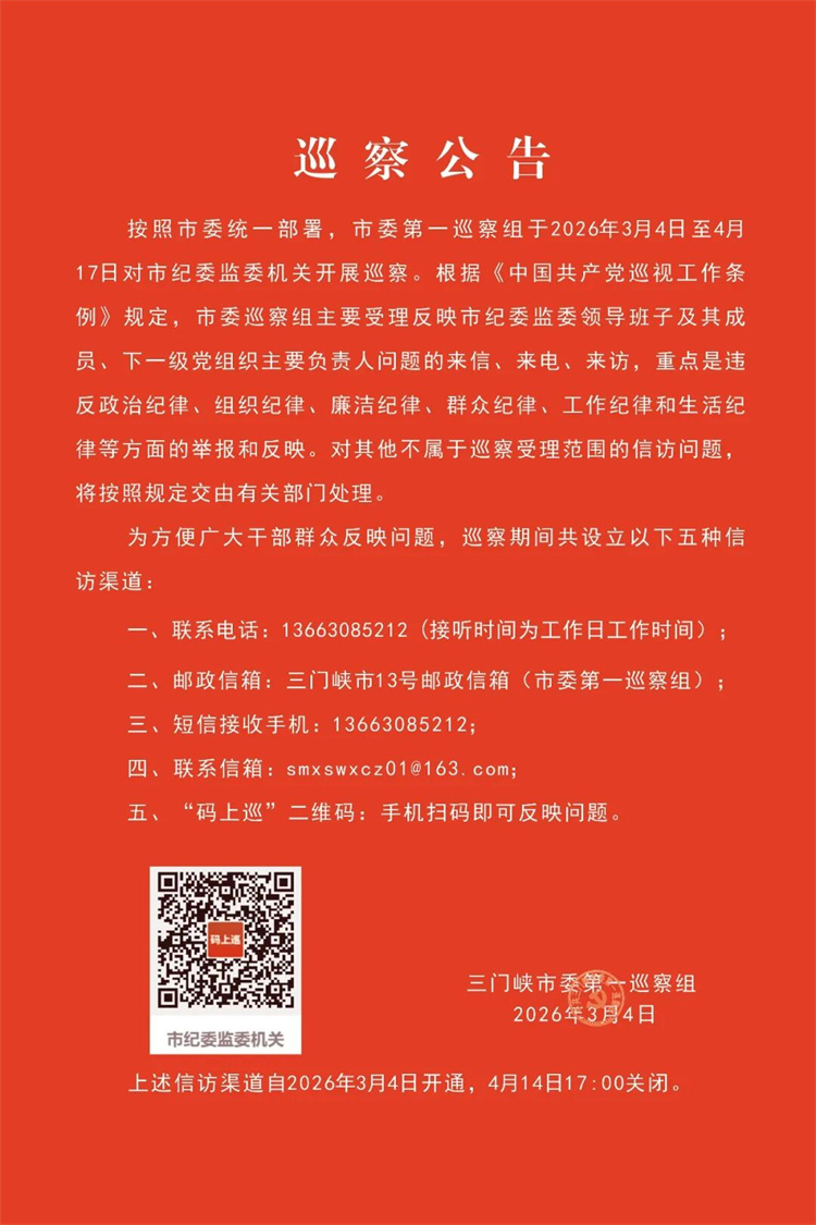 市委第一巡察组对市纪委监委机关开展巡察的时间为3月4日至4月17日。其间,巡察组设置联系电话、邮政信箱、短信接收手机、联系信箱、“码上巡”等渠道,同时,在市纪委监委及其下属单位办公地等设置“市委第一巡察组联系信箱”。以上信访渠道3月4日开通,4月14日17:00关闭。