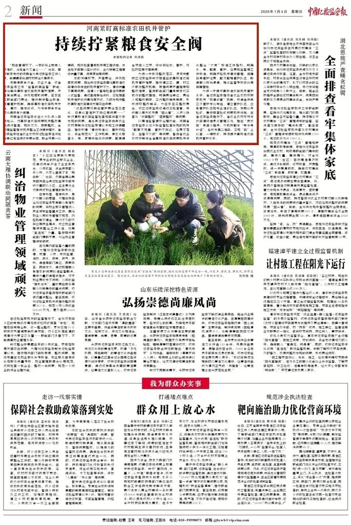 河南是粮食大省、农业大省。该省纪委监委立足“监督的再监督”职能,围绕解决高标准农田机井管护难题,严查背后责任、作风和腐败问题,压紧压实职能部门责任,推动制定整治标准、完善管护机制,确保高标准农田机井安全、高效、稳定运行,为守牢粮食安全底线提供有力保障。