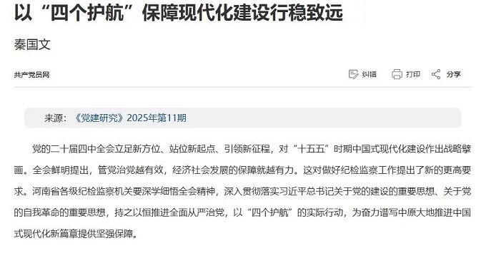 《党建研究》2025年第11期刊发中共河南省委常委,省纪委书记、监委代理主任秦国文署名文章《以“四个护航”保障现代化建设行稳致远》。