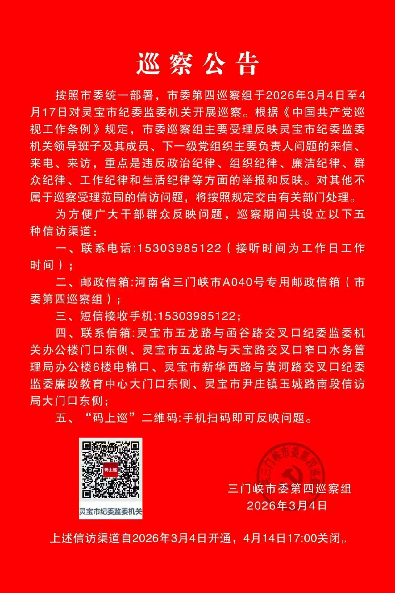 三门峡市委第四巡察组于2026年3月4日开始对灵宝市纪委监委机关开展为期45天的提级巡察。巡察组设置了联系电话、邮政信箱、短信接收手机、联系信箱、“码上巡”二维码等多种渠道接收各类信访信息,信访渠道已于3月4日开通,4月14日17:00关闭。