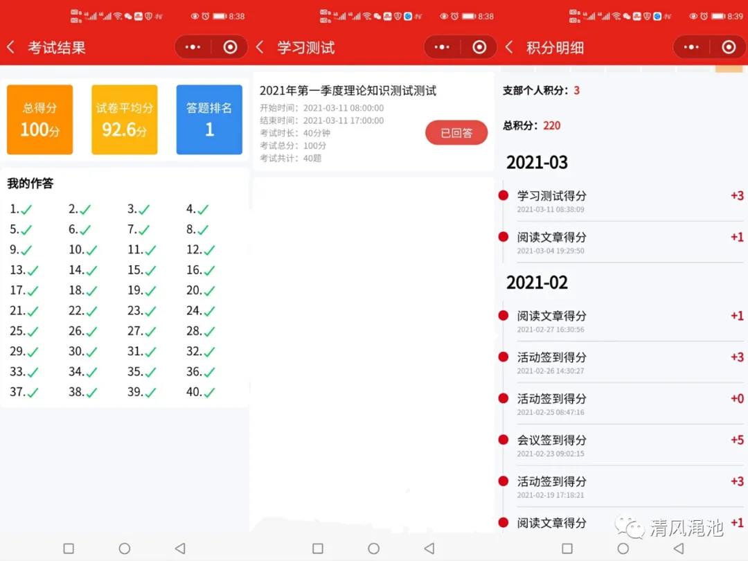 试题类型分为单选、多选、判断,答题时间为40分钟,参考率和通过率均达100%。此次测试着重检验第一季度党员干部学习党的理论知识成果和日常掌握情况,系统根据答题得分等级对党员干部自动生成个人积分,营造比学赶超的良好氛围,达到以考促学、以考督学、以考验学。