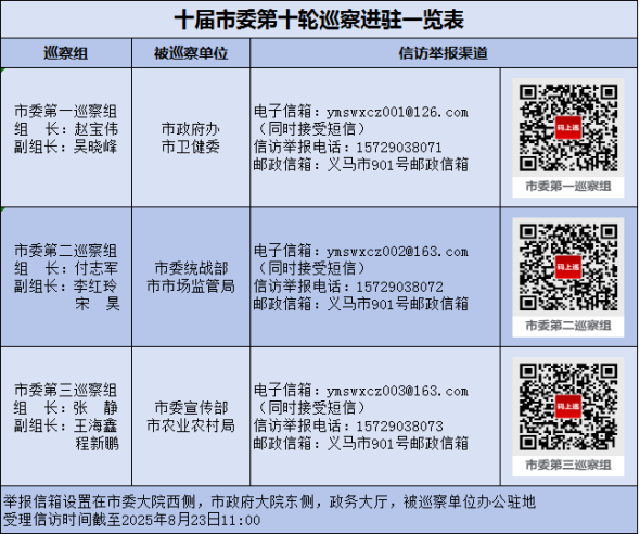 现场巡察时间为45天。巡察期间,各巡察组设立值班电话、联系信箱、电子邮箱、邮政信箱和“码上巡”,主要受理反映被巡察党组织领导班子及其成员,以及下一级党组织主要负责人和重点岗位人员问题的来信来电来访等,重点是违反党的政治纪律、组织纪律、廉洁纪律、群众纪律、工作纪律和生活纪律等方面问题的举报和反映。市委巡察组受理信访时间截止到8月23日上午11点。