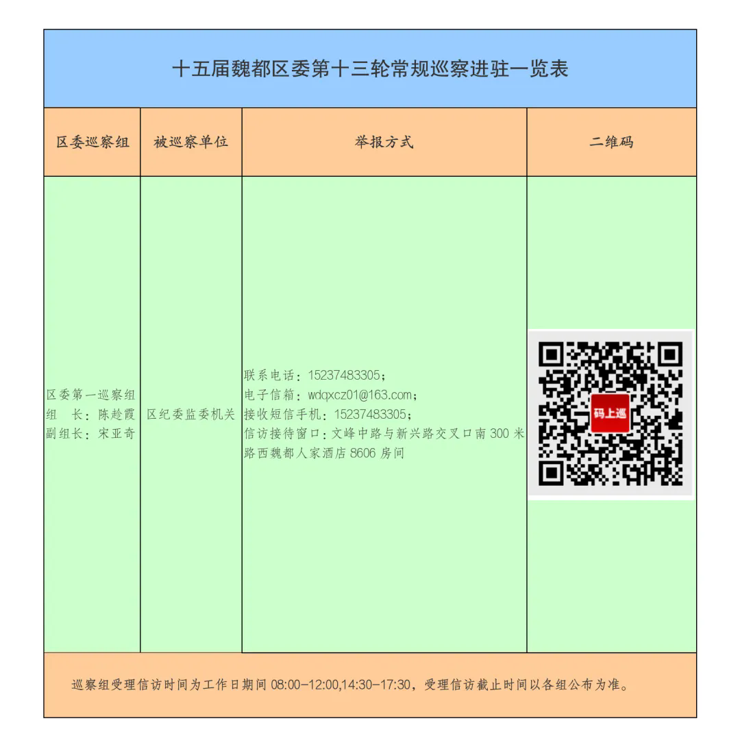 巡察期间,区委各巡察组开通专门联系电话、专用电子信箱、“码上巡”等信访举报方式,主要受理反映被巡察党组织领导班子及其成员,下一级党组织主要负责人和重点岗位人员问题的来信来电来访,重点是关于违反政治纪律、组织纪律、廉洁纪律、群众纪律、工作纪律和生活纪律等方面的举报和反映。对其他不属于巡察受理范围的信访问题,请按规定向有关部门反映。