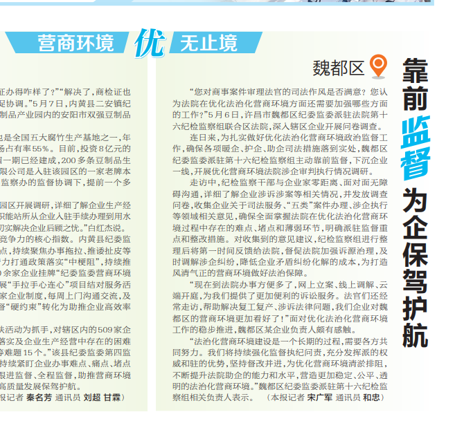 “您对商事案件审理法官的司法作风是否满意?您认为法院在优化法治化营商环境方面还需要加强哪些方面 的工作?”5 月 6 日,许昌市魏都区纪委监委派驻法院第十六纪检监察组联合区法院,深入辖区企业开展问卷调查。