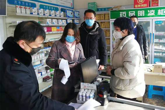 图为禹州市纪委监委干部在药店督促检查疫情防控工作落实情况