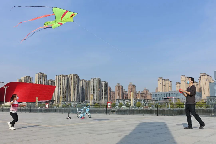 春分时节,有市民带着孩子到科技广场放风筝,在户外进行亲子活动,享受春日的温暖阳光,其乐融融。(牛原 摄)