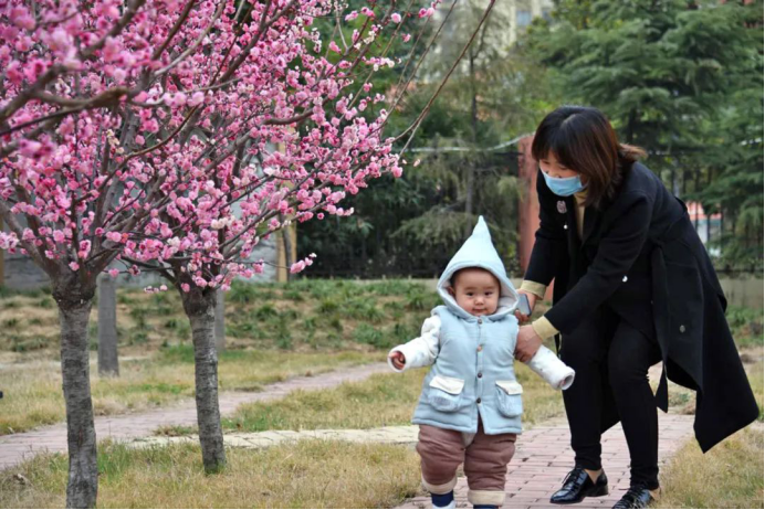 春分到,花儿俏,小宝宝们哈哈笑。美好的春分节气是宝宝们增强免疫力的黄金时间,在妈妈的搀扶陪伴下,远离闹市,让宝宝“0”距离地拥抱自然,感受大自然的有机呵护,欢喜雀跃露出了粉红俏皮的脸蛋儿。(朱书君 摄)