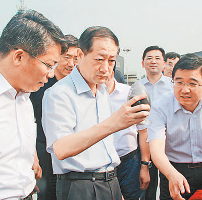 刘钦海(前左二)在泰安新环能清洁能源有限公司交流产品创新。
