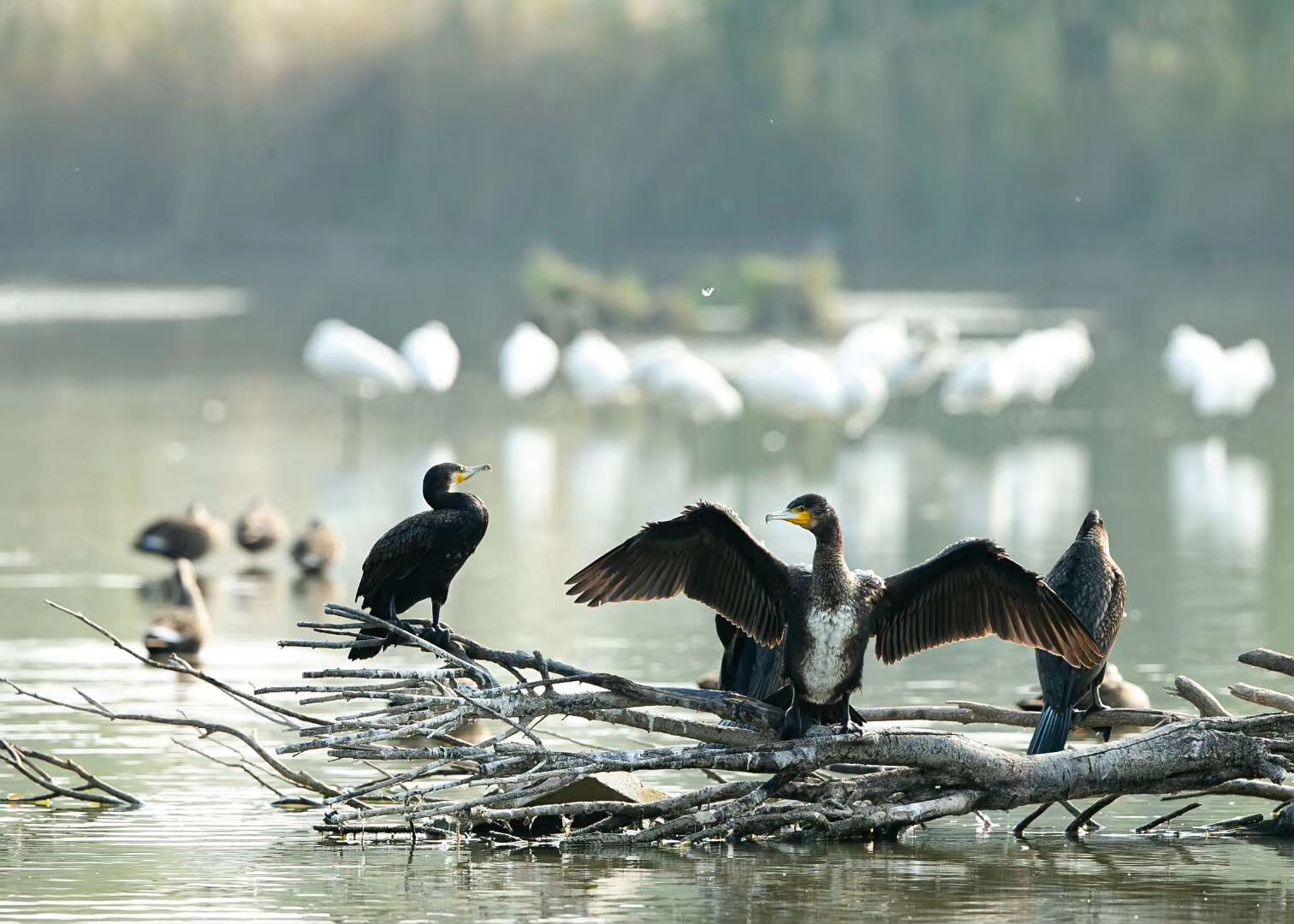 看,在水中的枯枝上或立或卧,抑或闲庭信步的鱼鹰,好像在谈论着冬雪何时到来,再也商量着在哪儿的簇芦苇荡里才足够温暖。