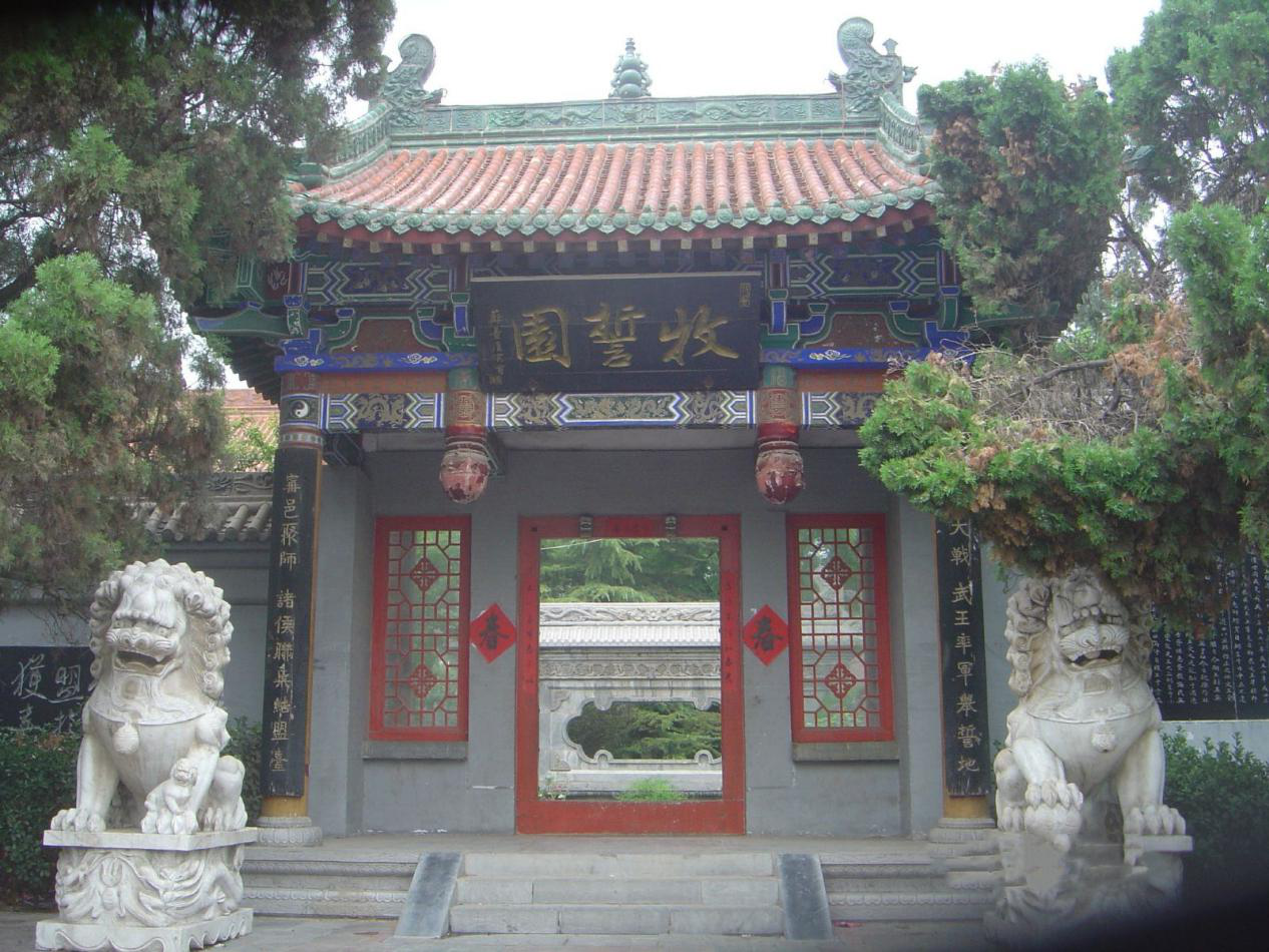 同盟山位于获嘉县城,该山(坛)为昔年周武王率师伐纣,在商郊牧野举行战前誓师的盟台,史料记载为诸侯兵捧土封之,即《尚书·牧誓》所载的牧誓之所,也是武王军举行牧野大战现存于地表的唯一物证。 其文化层丰富,考为龙山文化至商周文化遗址,属河南省重点文物保护单位。“诸侯演武场”、“诸侯井”、“周武王饮马池”、“姜太公校阅台”等古迹遗存与该山(坛)相依相连,交织形成了追溯牧野的战景、寻古探幽的千古景观。