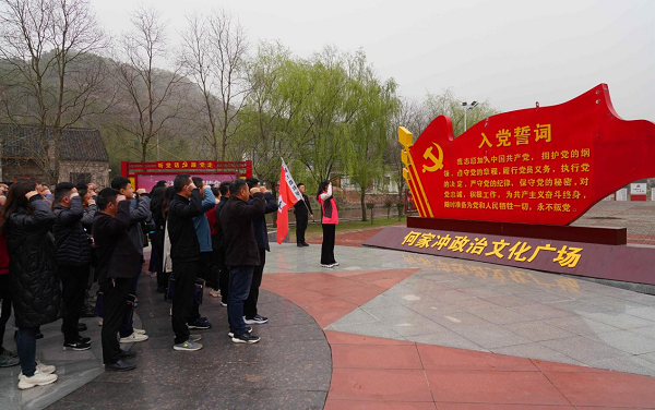 潢川县纪委监委组织全县纪检监察干部赴红二十五军长征出发地何家冲开展“学党史筑牢初心 学业务砥砺前行”党史学习教育培训。图为全体纪检监察干部在何家冲政治文化广场重温入党誓词。(摄影/李凯琦)