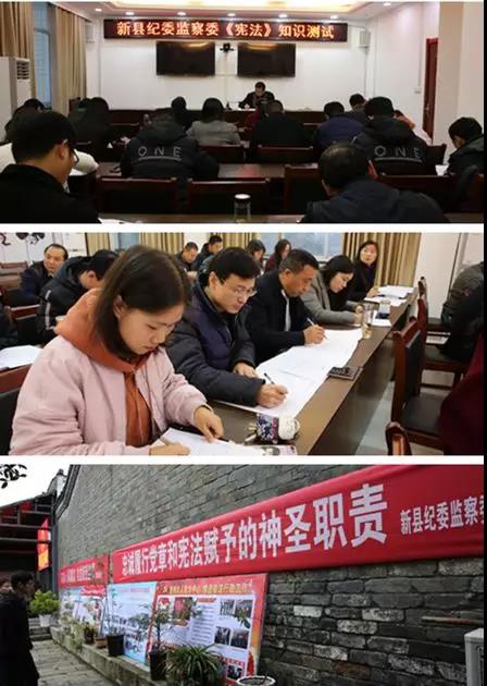 新县纪委监察委组织机关党员干部进行《宪法》知识考试,积极参与由县政法委、县委宣传部等单位组织的2018年“宪法宣传周”启动仪式暨宪法与法治文化书法展活动,并在活动现场悬挂宣传标语,在普法条幅上签名,参观宪法与法治文化和普法依法治理成果巡展。