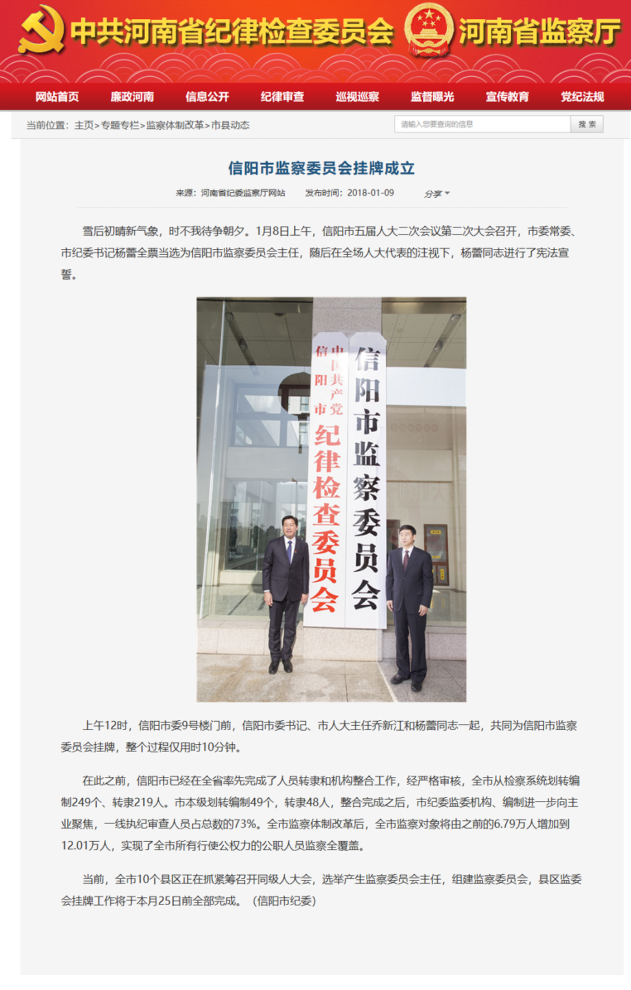 【省纪委网站信息】信阳市监察委员会挂牌成立
