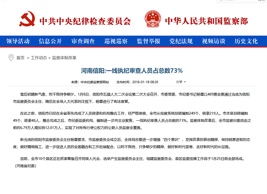 【中纪委网站信息】河南信阳:一线执纪审查人员占总数73%