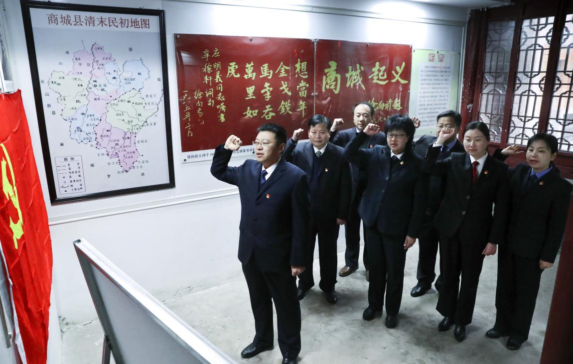 近日,新成立的首届商城县监察委领导班子成员来到赤城苏维埃政府旧址瞻仰遗迹,忆党史、感党恩、听党话、跟党走。面对庄严的党旗,该县监察委领导班子成员整齐列队,重温入党誓词,表达“不忘初心、牢记使命”的坚定政治信念,重拾入党的激情和动力。(图/鲍 云 文/张仁君)