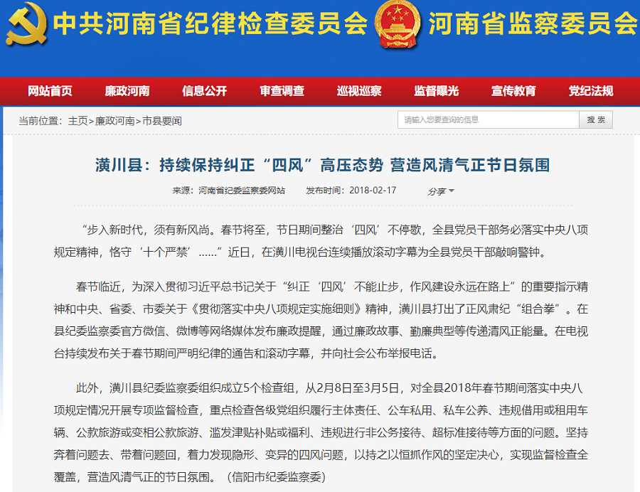 【省纪委网站要闻】潢川县:持续保持纠正“四风”高压态势 营造风清气正节日氛围