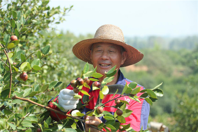 9月11日,眼看着棕红的、青黄的油茶果密密地缀满枝头,再有一个多月,就可以收油茶果了,老袁满怀丰收的期盼,正在查看他的“金疙瘩”。(光山县纪委监委 盛鹏 摄)