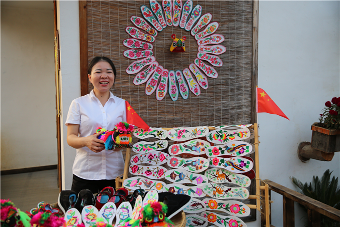 许多游客慕名来到新县田铺大塆购买手工艺品,总书记买过的“五谷丰登”“喜上眉梢”“年年有余”三款鞋垫一直畅销。(新县纪委监委 孙立建 摄)