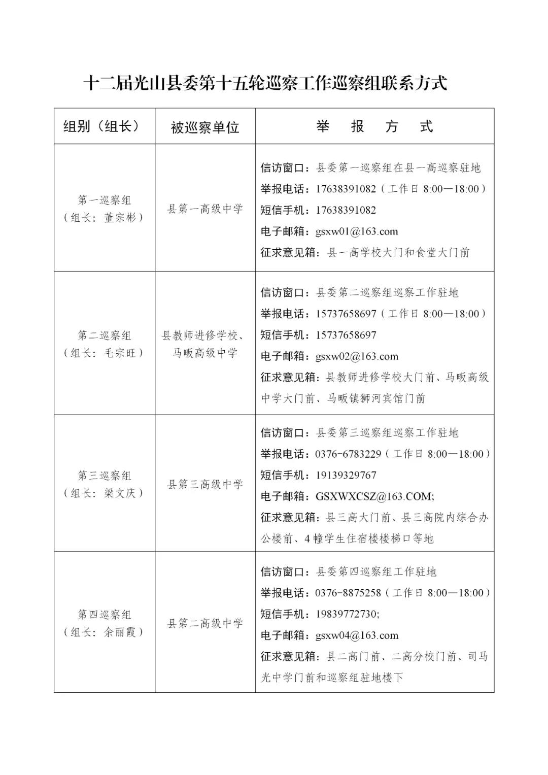 巡察期间,各巡察组均开通值班电话、接收短信手机和电子邮箱等举报方式,并设立举报信箱,具体如下: