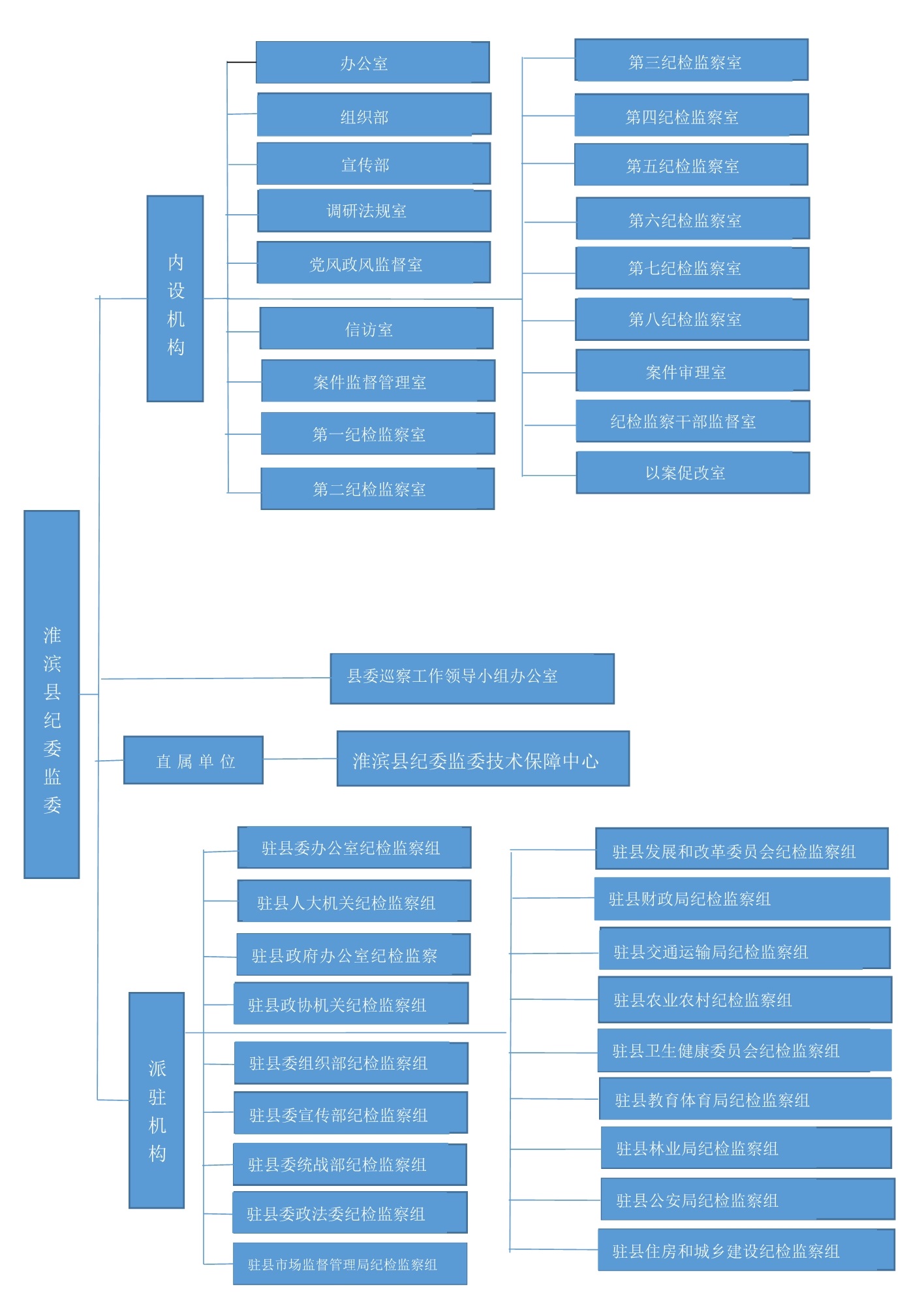 淮滨县纪委机关与淮滨县监察委合署办公。共有18个内设机构。下属1个事业单位:淮滨县纪委监委技术保障中心。实行统一管理的派驻机构18个。县委巡察工作领导小组办公室设在县纪委。