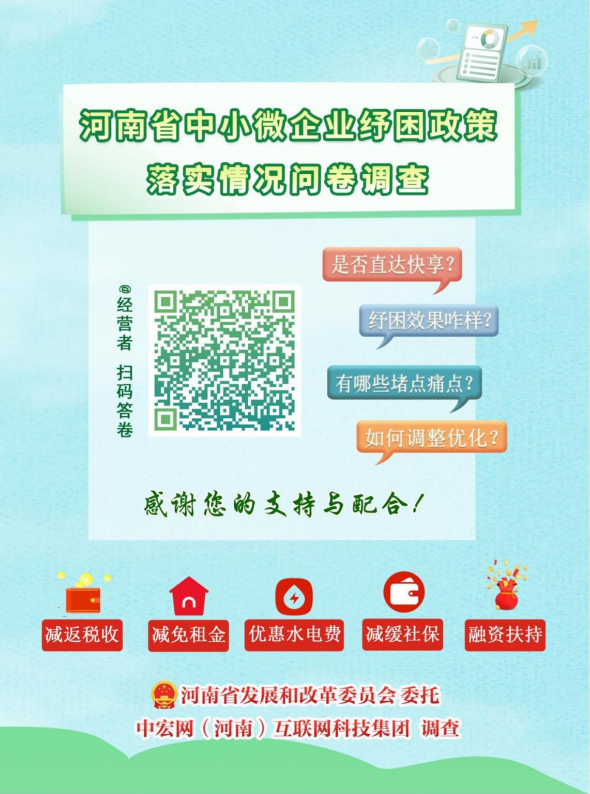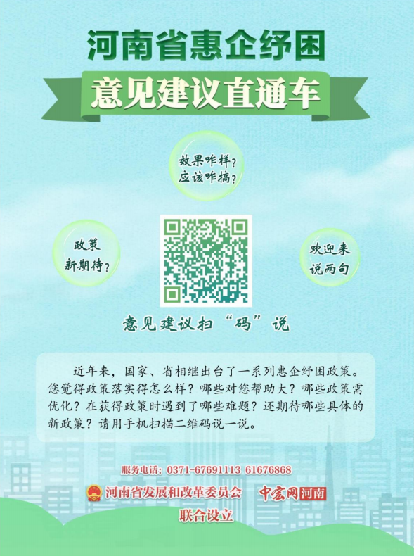 “河南省惠企纾困意见建议直通车”将广泛收集市场主体有切身感受的有关惠企纾困的典型举措、成功经验,各项政策落实中的难点、痛点、堵点,以及新形势下惠企纾困政策调整优化的意见建议等,为有关部门提供决策参考。“河南省惠企纾困意见建议直通车”海报将长期在各地政务服务中心、专业办事大厅、基层站所等显著位置展示,广大市场主体、办事群众和各界人士可以现场扫描海报上的二维码,参与互动。