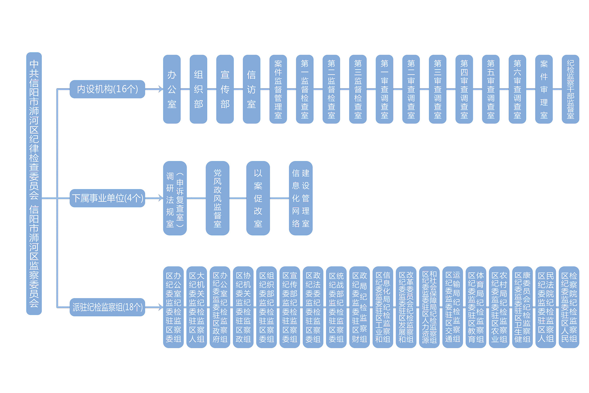 浉河区纪委机关与浉河区监察委合署办公。共有16个内设机构,分别为:办公室、组织部、宣传部、信访室、案件监督管理室、案件审理室、第一执纪监督室至第三执纪监督室、第一审查调查室至第六审查调查室、纪检监察干部监督室。下属4个事业单位:以案促改室、调研法规室、党风政风监督室,信息化网络建设管理室。实行统一管理的派驻机构18个。