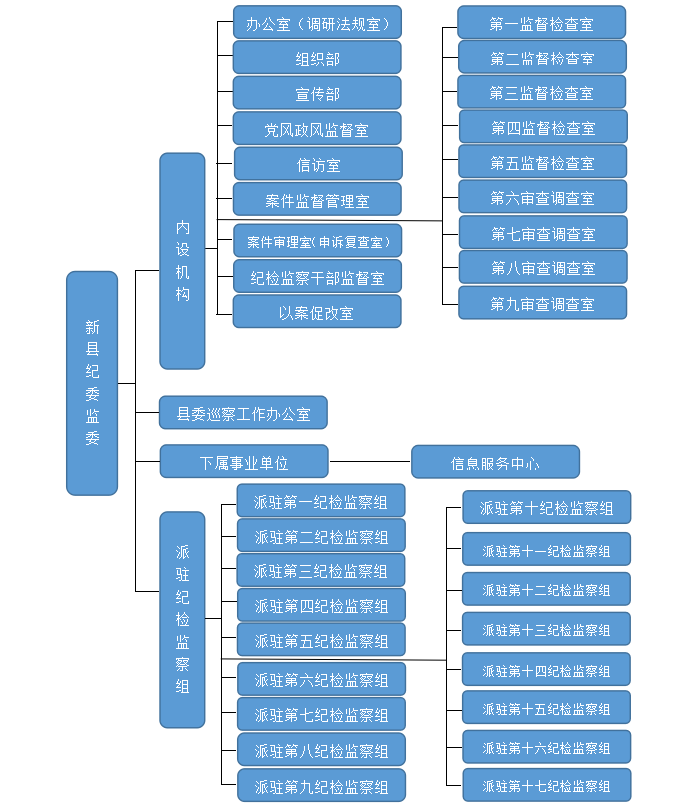 新县纪委机关与新县监察委合署办公,共有18个内设机构,分别为:办公室、组织部、宣传部、党风政风监督室、信访室、案件监督管理室、第一至第五监督检查室、第六审查调查室至第九审查调查室、案件审理室、纪检监察干部监督室、以案促改室。下属1个事业单位:信息服务中心。实行统一管理的派驻机构17个。