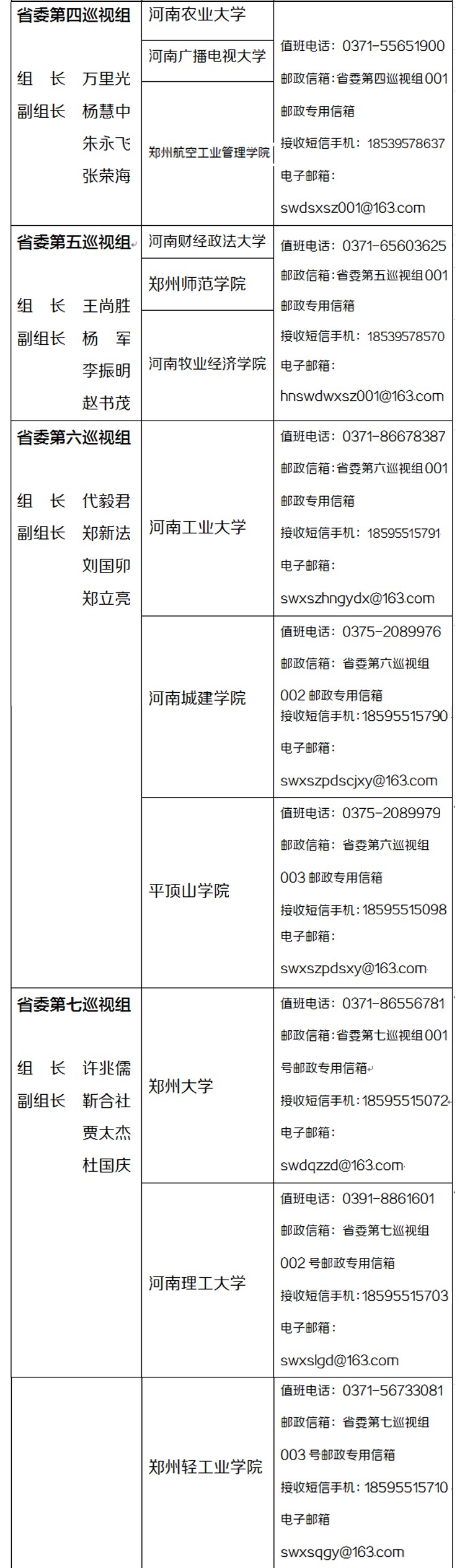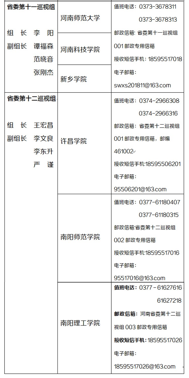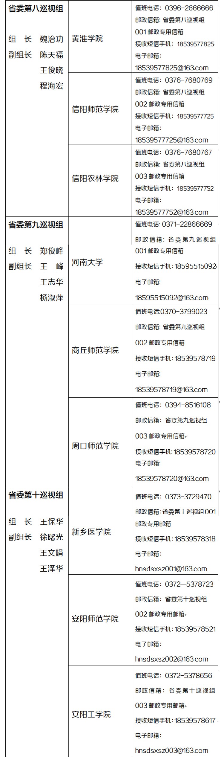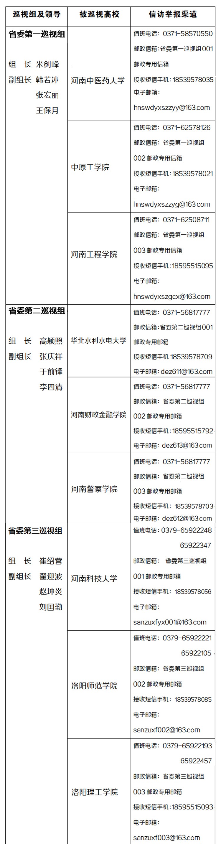 本轮巡视从11月初开始,每个巡视组负责对3个省管本科院校开展常规巡视,巡视时间45天左右。巡视期间,省委各巡视组均开通专门值班电话、邮政信箱、电子邮箱、接收短信手机和联系信箱。省委巡视组受理信访举报的时间为工作日8时至20时,巡视结束后信访渠道自行关闭。