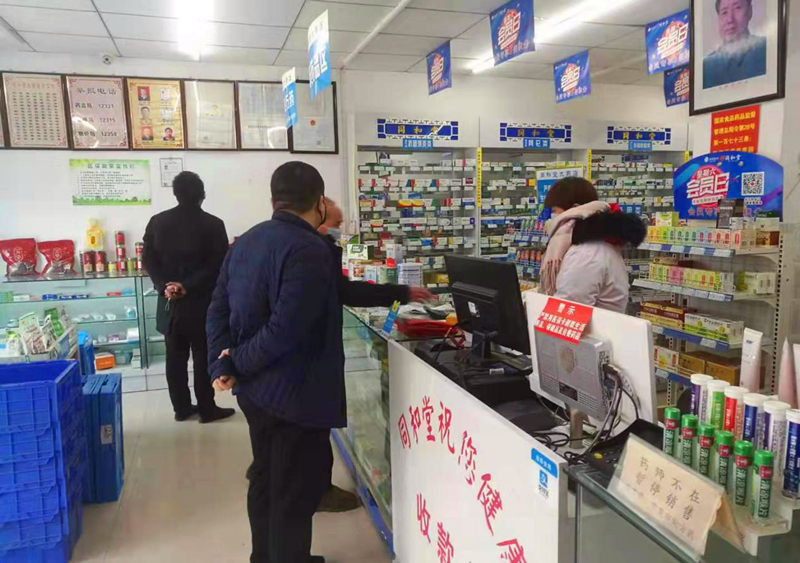 1月28日,沈丘县纪委监委专项督导组和沈丘县市场监管局工作人员在沈丘县城内一家药店督导疫情防控,加强对新型冠状病毒防控相关商品的生产、销售和价格监管。