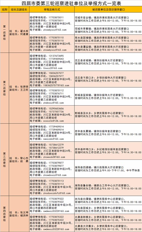 5月8日,周口市委4个巡察组采取一组托2县、大组带分组的方式,分别进驻项城市官会镇、李寨镇,商水县固墙镇、谭庄镇,沈丘县老城镇、卞路口乡,郸城县宜路镇、汲水乡,西华县东夏镇、叶埠口乡,淮阳县四通镇、鲁台镇,扶沟县白潭镇、固城乡,太康县转楼乡、大许寨乡16家单位,进行涉农扶贫领域机动式专项巡察。巡察对象为被巡察单位党委领导班子及其成员和其他副科级以上领导干部,巡察时间为5月8日至27日。