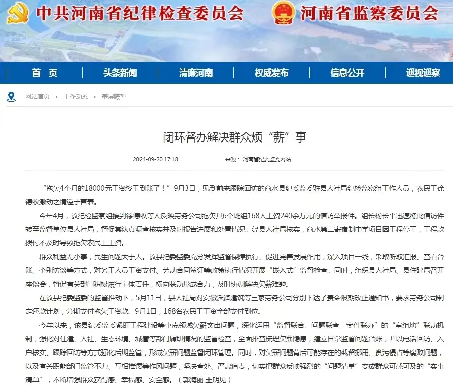“拖欠4个月的18000元工资终于到账了!”9月3日,见到前来跟踪回访的商水县纪委监委驻县人社局纪检监察组工作人员,农民工徐德收激动之情溢于言表。