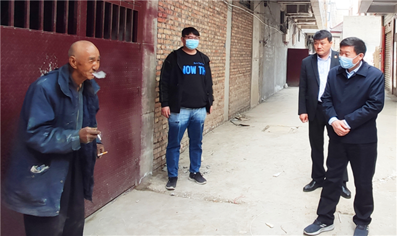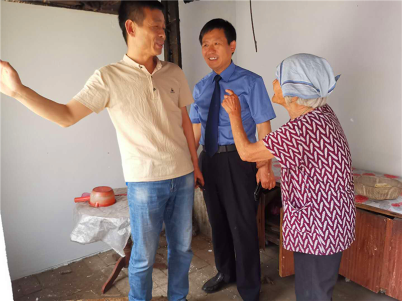 商水县纪检监察干部在“小网格大走访全覆盖”活动中,深入到户,一线监督惠民政策落实。图为县纪委监委派驻第十三纪检监察组组长王国志(左一)在帮助贫困户改善住房条件,解决住房困难问题。(程昂飞 摄)