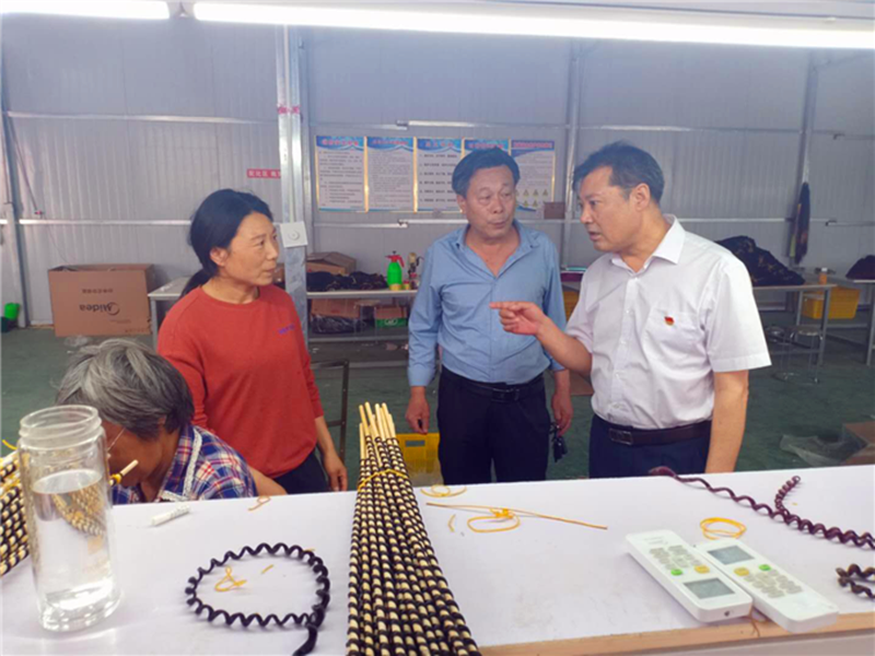 在太康县常营镇五子王行政村的扶贫车间里,周口市纪委监委驻市发改委纪检监察组组长郭玉明详细了解生产经营情况,聚焦“六稳”“六保”跟进监督,并对各个扶贫车间的租金减免缓补情况进行检查。(王兴亮 摄)