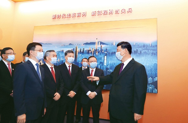2020年10月14日,深圳经济特区建立40周年庆祝大会在广东省深圳市隆重举行。中共中央总书记、国家主席、中央军委主席习近平在会上发表重要讲话。这是当天上午,习近平等参观“从先行先试到先行示范——庆祝深圳经济特区建立40周年展览”。 新华社记者 鞠鹏 摄