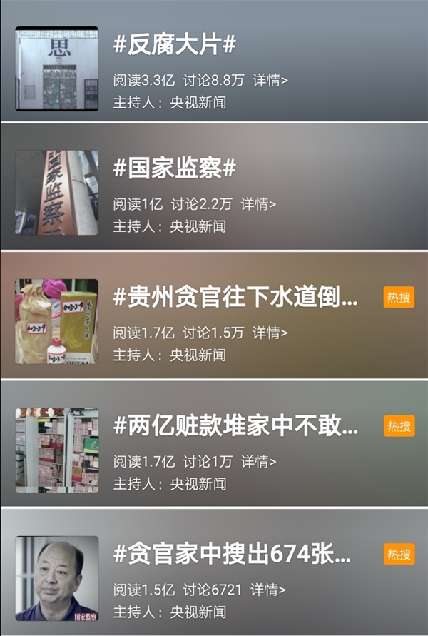 在《国家监察》纪录片引爆全网的同时,纪录片中的诸多细节也引发网友关注。“反腐大片”“国家监察”“贵州贪官往下水道倒茅台倒不尽”“两亿赃款堆家中不敢花”“贪官家中搜出674张购物卡”等与《国家监察》相关的话题纷纷进入微博热搜榜。