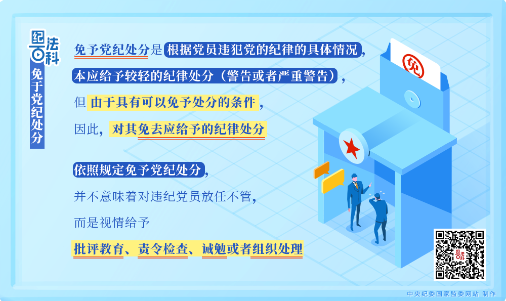 免予党纪处分是根据党员违犯党的纪律的具体情况,本应给予较轻的纪律处分(警告或者严重警告),但由于具有可以免予处分的条件,因此,对其免去应给予的纪律处分。依照规定免予党纪处分,并不意味着对违纪党员放任不管,而是视情给予批评教育、责令检查、诫勉或者组织处理。