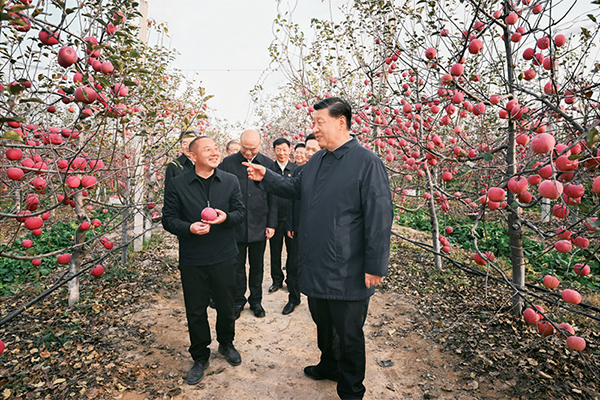 2022年10月26日至28日,中共中央总书记、国家主席、中央军委主席习近平在陕西省延安市、河南省安阳市考察。这是26日下午,习近平在延安市安塞区高桥镇南沟村苹果园同老乡们亲切交流。 新华社记者 燕雁/摄